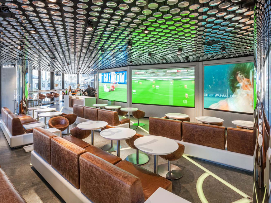 Neben der Geschichte der FIFA und der Fussball-Weltmeisterschaft zeigt eine interaktive und multimediale Erlebniswelt, wie der Fussball jeden Tag weltweit Emotionen weckt und Menschen begeistert. Auch se Lightmanagement hat einen namhaften Beitrag zu diesem exklusiven Projekt geleistet. Dank der dezent in die Fassade integrierten Beleuchtung erstrahlt das imposante Gebäude nachts im Glanz des warmweissen LED-Lichts. Somit steht es gut sichtbar im Mittelpunkt des städtischen Treibens. Auch im Innenbereich gibt es einen besonderen Anziehungsmagneten. In der Sportsbar werden Spiele auf einer Grossleinwand übertragen. Sobald ein Tor fällt, wird die im Boden eingelegte interaktive LED-Lichtlinie aktiviert und jubelt mit. Lichtblitze, schnelle Farbwechsel und durch den Raum rasende Farbmuster entfachen ein wahres Feuerwerk. Sobald sich der Torjubel wieder etwas gelegt hat, leuchtet auch die LED-Lichtlinie wieder in reinweissem Licht und sorgt für eine angenehmes Raumgefühl.
